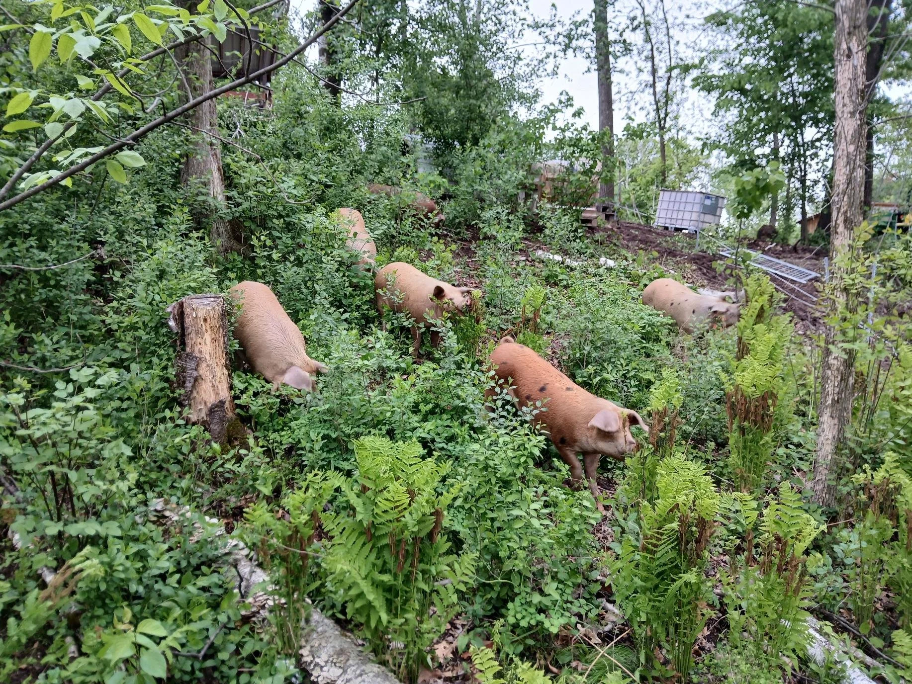 We free range our hogs in a natural setting, where they live their best life, rooting and wallowing as they please. Whether in the forest or on pasture, this environment provides them with ample space, fresh air, and sunshine. Their temporary electric fence is moved every one to two weeks which ensures they’re on fresh ground to keep them healthy. This controlled rooting also disturbs the soil just enough to encourage grass and other beneficial perennials to grow. Over time this will bring more diversity and health to the little ecosystem we’re stewarding.